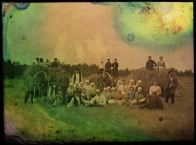 Sajanditagune värvifoto: Johannes Paul Mihklimets (1889–1954). Heinalised Eidapere või Vändra lähistel 1910.–1920. aastatel. Värviline diapositiiv klaasil (Autochrome Lumière), 9 × 12 cm. Eesti Ajaloomuuseum, AM F 19636:2