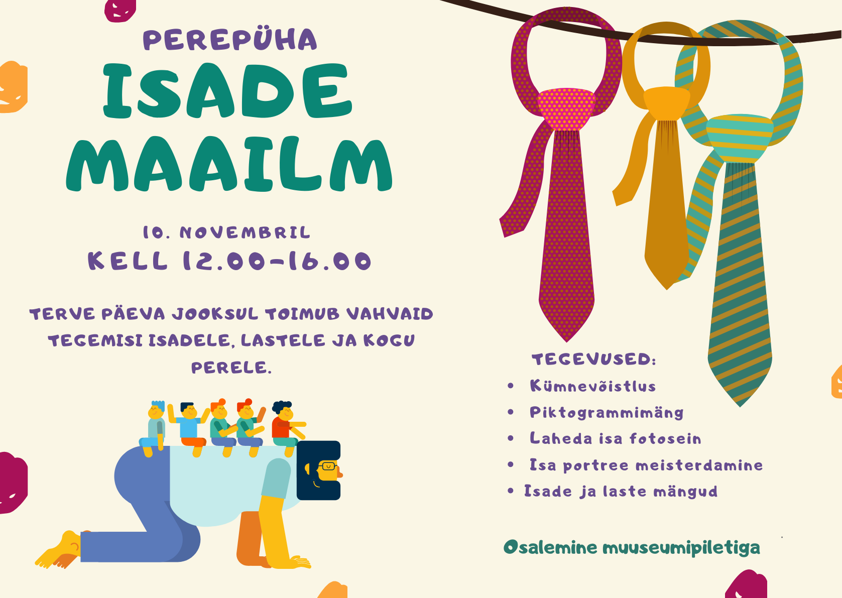 Muuseumis saab sel päeval koos isaga mängida Miiamilla kümnevõistlust, kus tähtis on olla nutikas ja tähelepanelik. Hea tuju üleval hoidmiseks paneme kokku isade nägudest naljakaid mutri-kruvi-vedru portreesid. Päeva keerame kraadivõrra toredamaks vanas fotoateljees, kus kõik saavad pildile jääda kõige suuremate habemete, vahvate vuntside ning isamoodi ja isemoodi lennukate soengutega.