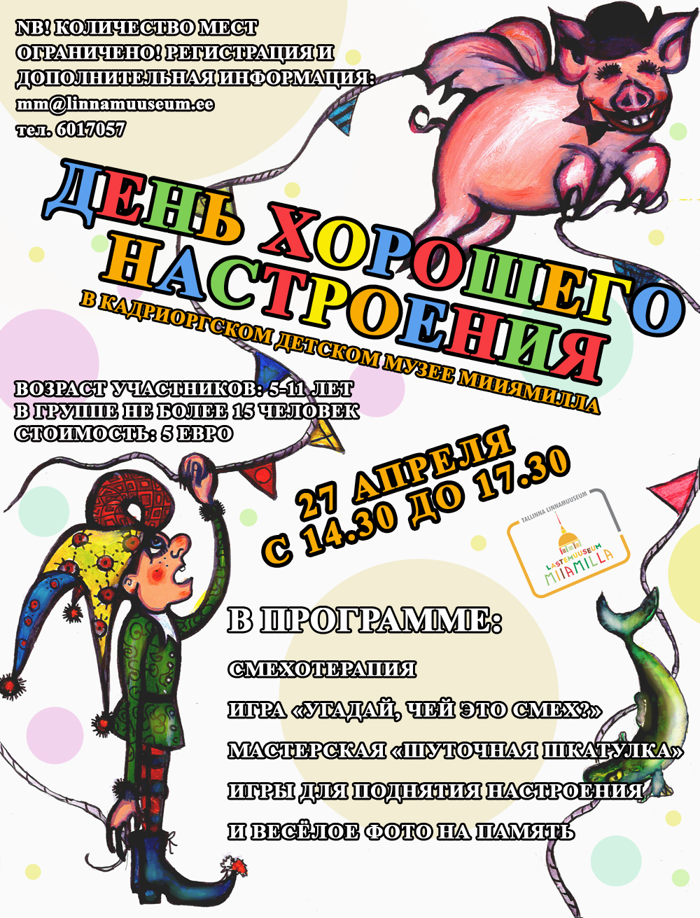 Апрель- месяц шуток и веселья! 27 апреля, в пятницу, Кадриоргский детский музей Мииямилла приглашает ребят 5-11 лет весело провести время. Устроим для всех День хорошего настроения! Шутим, играем и мастерим вместе с друзьями.