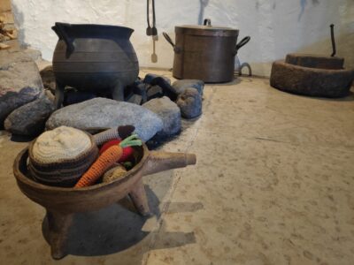 - В следующем зале, посвященному морским путям, спрятана плетеная коробка с бытовыми предметами того времени. По очереди доставая предметы из коробки, ребята могут подержать их в руках и определить, из чего они сделаны, повторяя названия материалов на эстонском языке. Рассматривая и примеряя средневековую одежду, словарный запас пополняется названиями цветов и прилагательными, связанными с одеждой.
