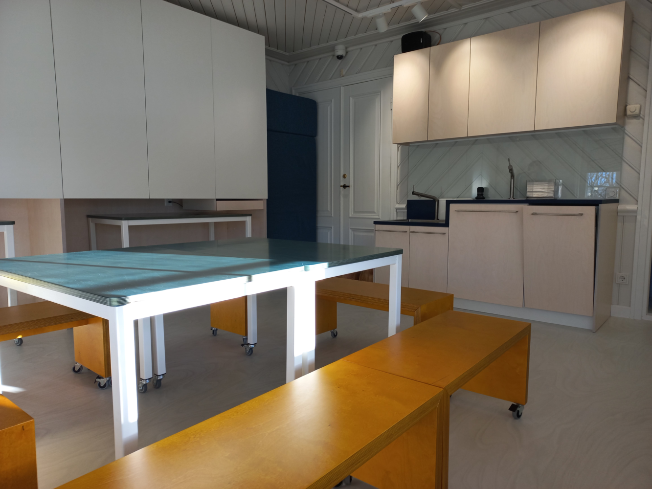 - Возможность использования посуды и столовых приборов на 25 персон: чашки, блюдца, ложки. Также имеются лопатки и ножи для торта, чайник и кофейный аппарат.