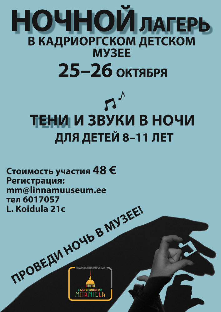 Уже по сложившейся на осенних каникулах традиции Кадриоргский детский музей Мииямилла откроет свои двери в ночное время, чтобы дать детям 8-11 лет уникальную возможность провести ночь в музее.