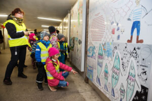 Näitus jalakäijate tunnelis Kellukese lasteaia lapsed ja õpetaja Maris Laaneväli