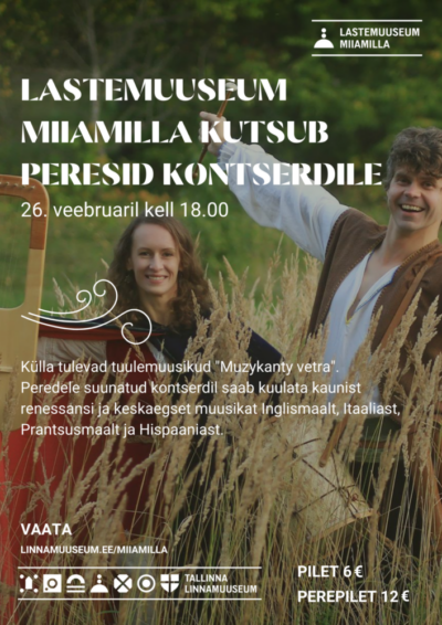 Veebruari viimasel laupäeval, 26.02 kell 18.00 esineb peredele Muzykanty vetra (eesti keeles “tuulemuusikud”). Nemad tulevad meile külla Pihkvast. Kõik pered, väikesed ja suured sõbrad on oodatud kuulama renessansi ja keskaja muusikat Inglismaalt, Itaaliast, Prantsusmaalt ning Hispaaniast. Kontserdil esitatakse tantsulisi viise ja muusikat ja kestab umbes 45 minutit.