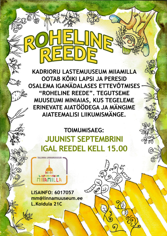 Tegutseme muuseumi miniaias – tegeleme erinevate aiatöödega ja mängime aiateemalisi liikumismänge. Rohelised reeded toimuvad juunist septembrini igal reedel kell 15.00.