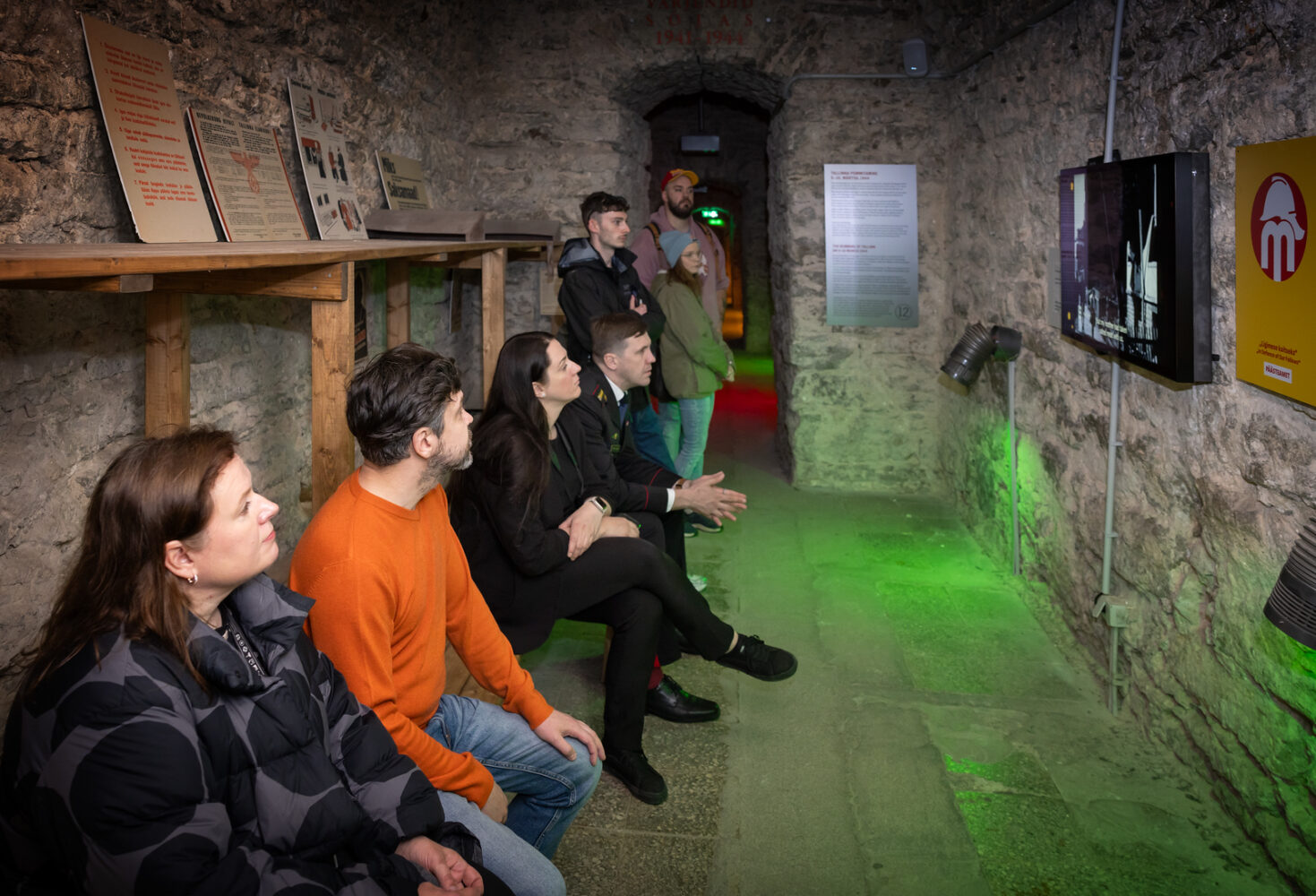 The exhibition begins with a journey to the historical tunnels and ends underground, where visitors can watch an interview film created for this exhibition. The central figure of the film survived the March 1944 bombing of Tallinn and recalls the event through the memories of a 10-year-old child.