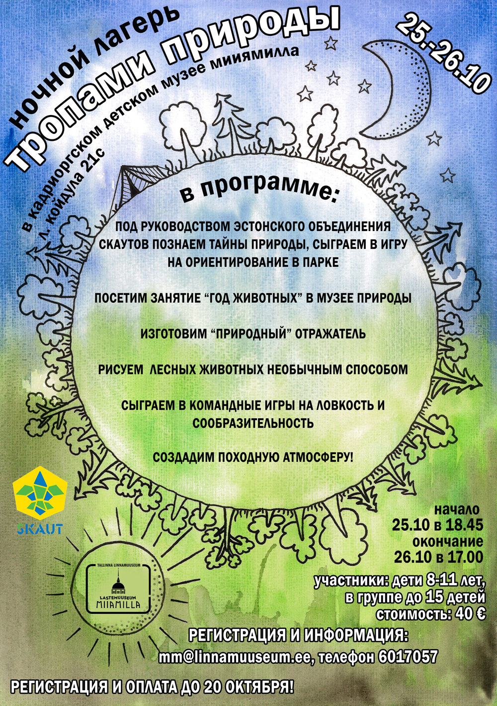 В этот раз предлагаем совершить поход за новыми знаниями и практическими навыками, пройдя по тропам природы. Бережно относиться к природе, познать её, научиться элементарным навыкам выживания в диких условиях — нам помогут настоящие скауты! О разнообразии животного мира Эстонии мы узнаем, посетив образовательную программу Эстонского музея природы. Весёлые подвижные игры, необычные мастерские, новые знакомства помогут нам создать хорошее настроение на протяжении всего лагеря!