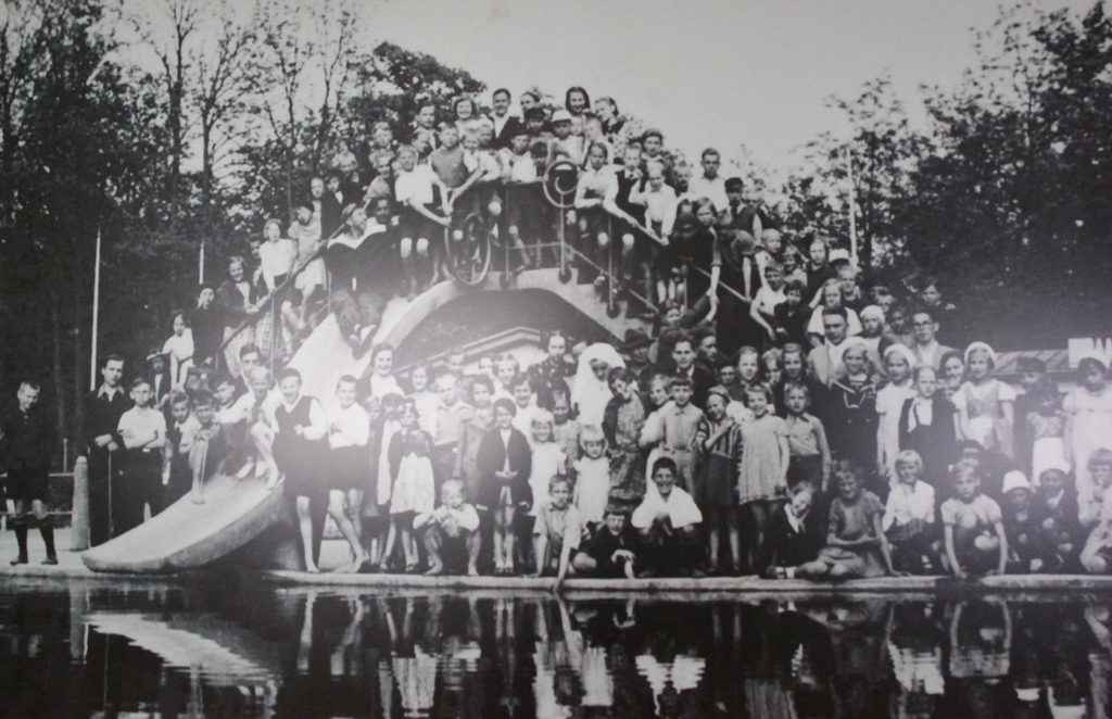 Перед детским музеем находится детская площадка с большими песочницами, качелями и каруселями. Раньше эта часть парка называлась «Молодежный парк», и перед главным зданием располагались бассейны, где проводились тренировки по плаванью, а на площадках играли в игры с мячом и занимались ритмикой. Найди точно такую же горку и сделай на ней веселую фотографию! Координаты для поиска места 59.436867, 24.788996. Фотографию можно увидеть в детском музее Мииямилла.