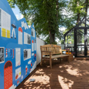 Avatud on lasteala, mis pere pisemate tarbeks on varustatud temaatiliste värvimislehtedega.